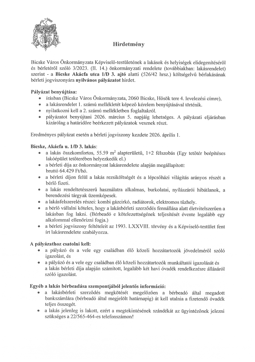 Nyilvános pályázat bérleti jogviszonyra (Akácfa utca 1/D 3.)