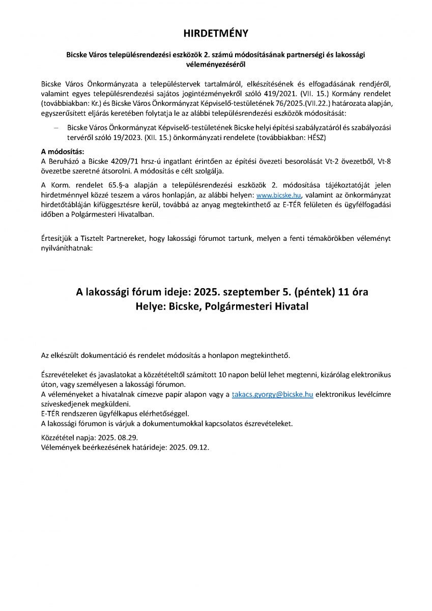 Településrendezési eszközök 2. számú módosításának partnerségi és lakossági véleményezése