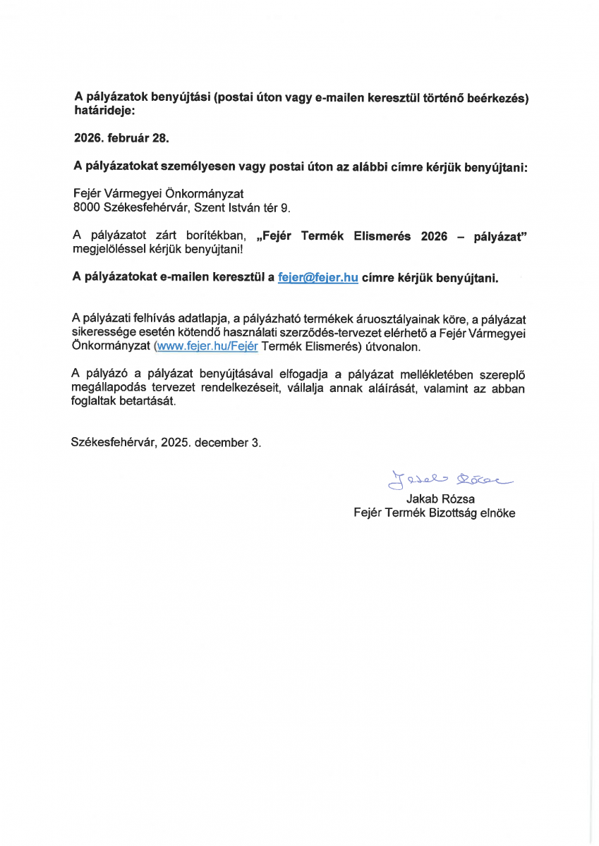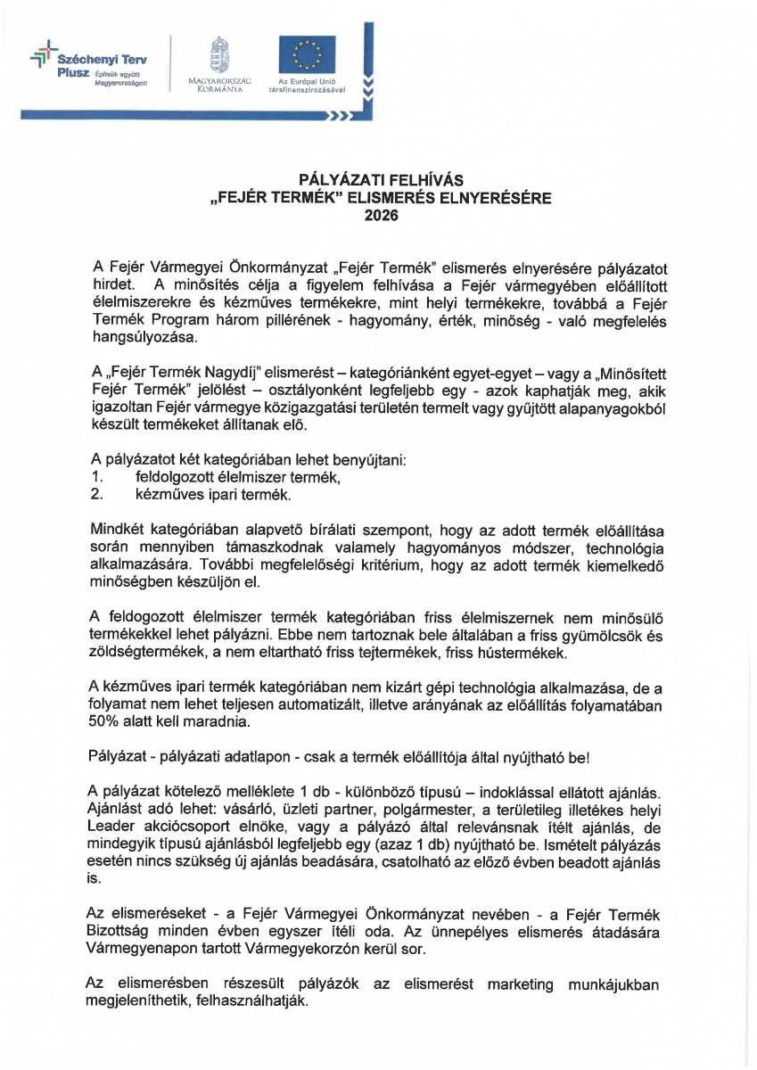 Pályázati Felhívás Fejér Termék Elismerés elnyerésére