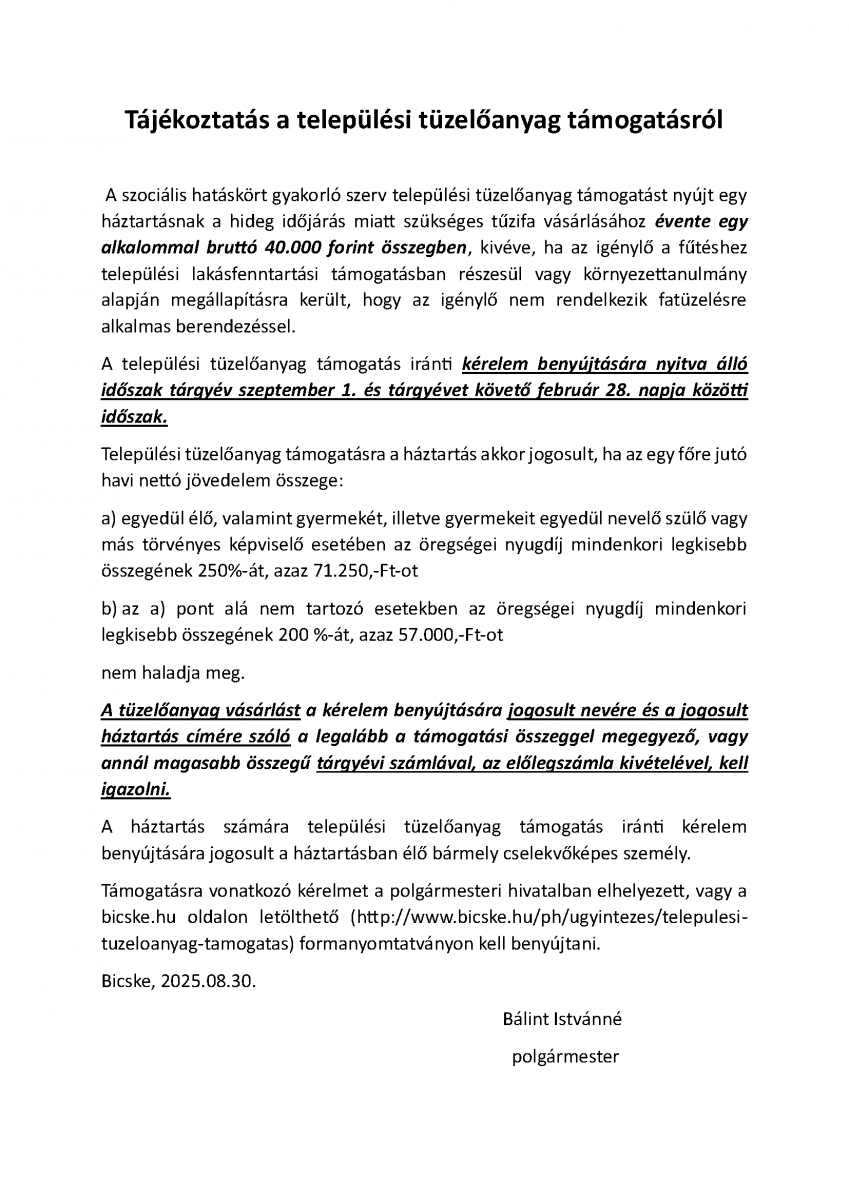 Tájékoztatás a települési tüzelőanyag támogatásról