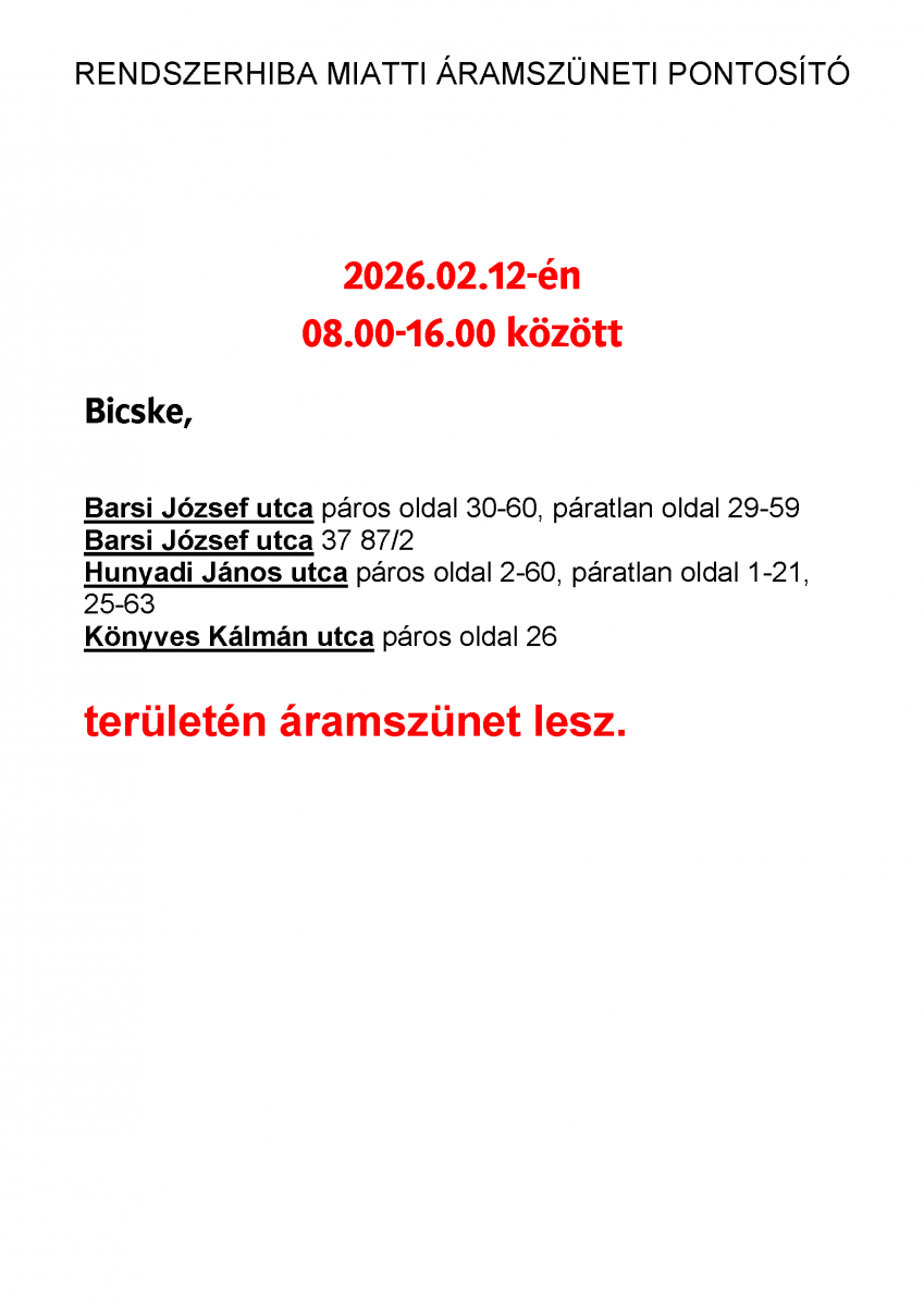 Áramszünet ideje: 2026.02.12. 08:00 - 16:00 (A korábban kiküldött értesítőlben tévesen adták meg az időpontot, így helyes)